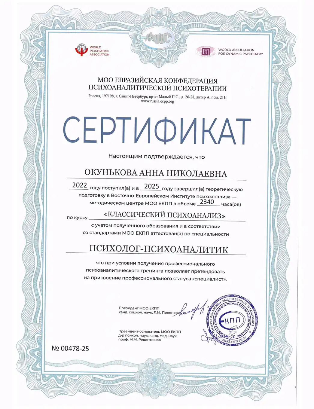 • 2021 - Интернациональный институт консультирования и психотерапии им. Ханскарла Лёйнера. Институт символдрамы (Сертификат о прохождении курса повышения квалификации в рамках программы обучения Кататино-имагинативной психотерапии)
